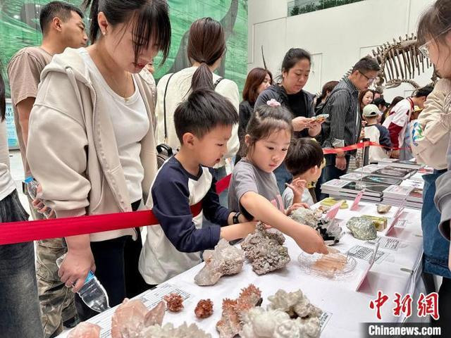 在“地蕴藏宝阁”互动展区,展示来自国家岩矿化石标本资源库和中国地质大学(北京)博物馆的馆藏矿石、化石与宝石标本,观众通过大学生志愿者讲解,深入了解各类矿产资源的形成过程与珍贵价值。